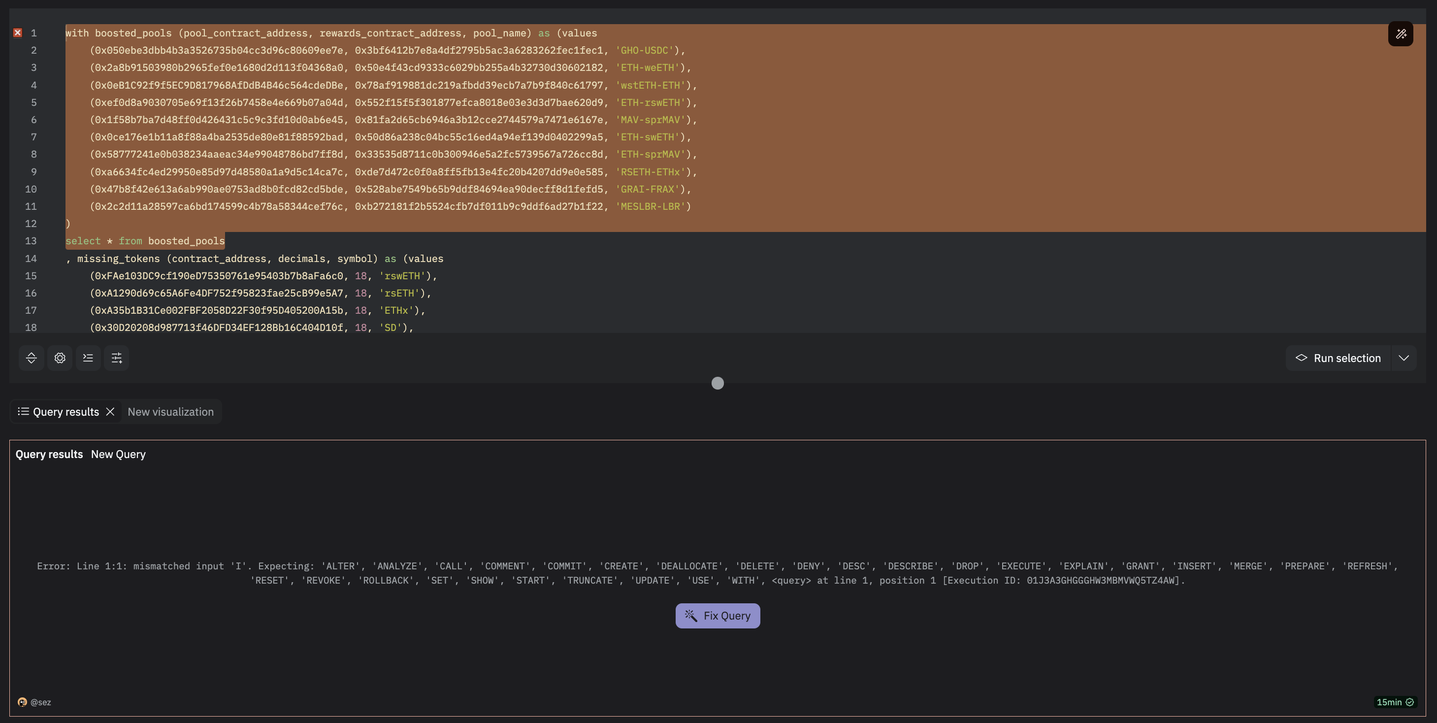 The expected behaviour is upon execution of the highlighted section it should return the boosted_pools cte.